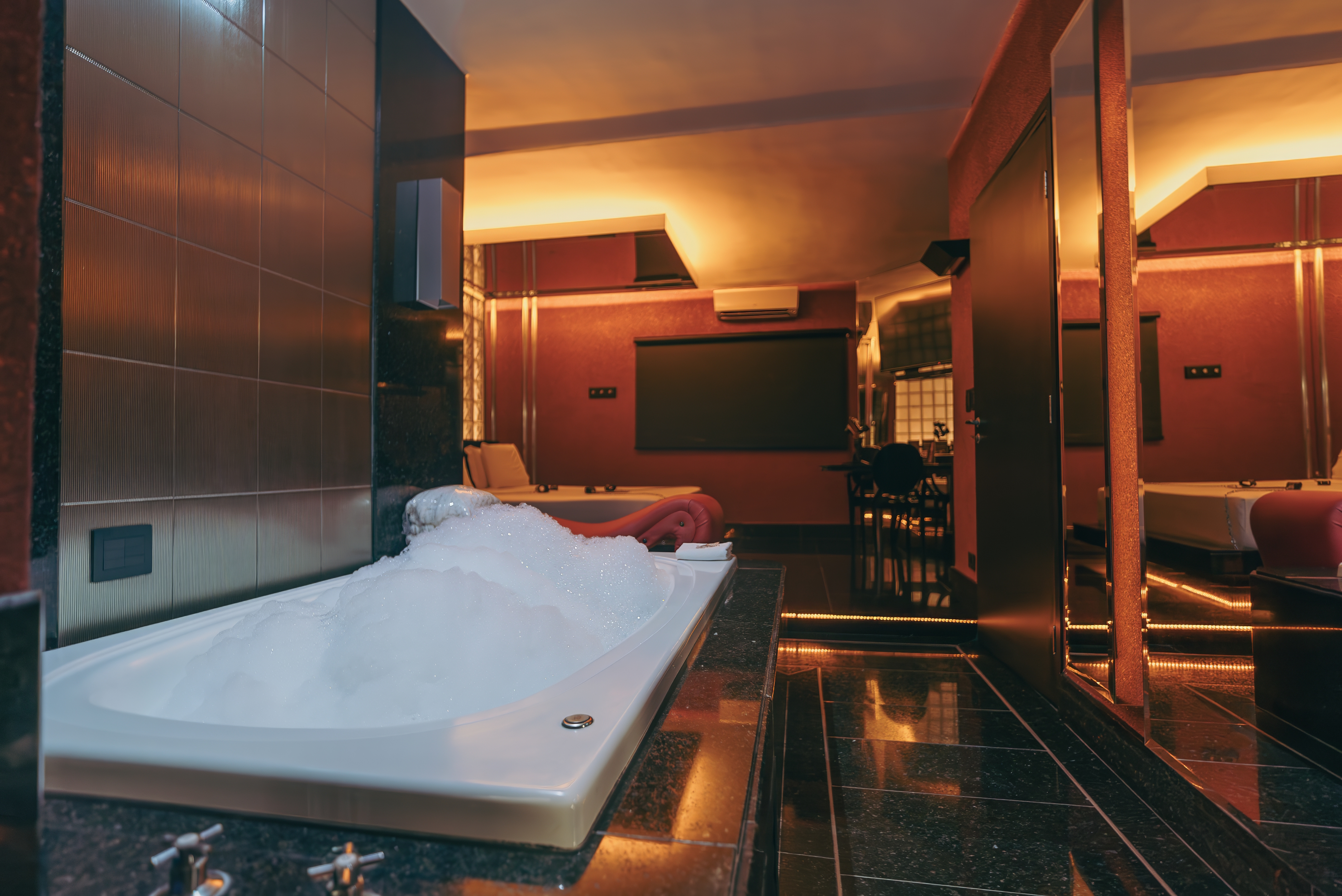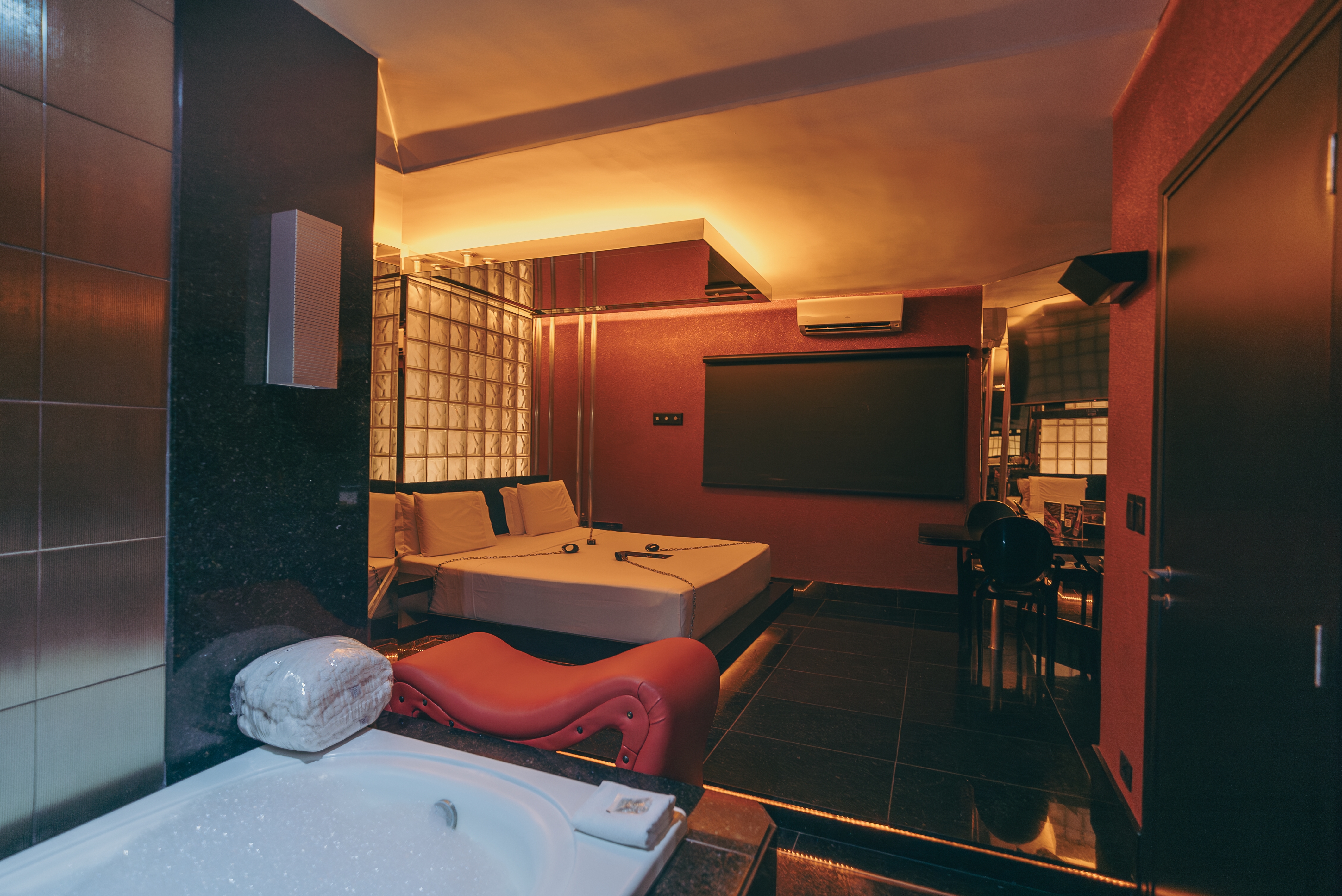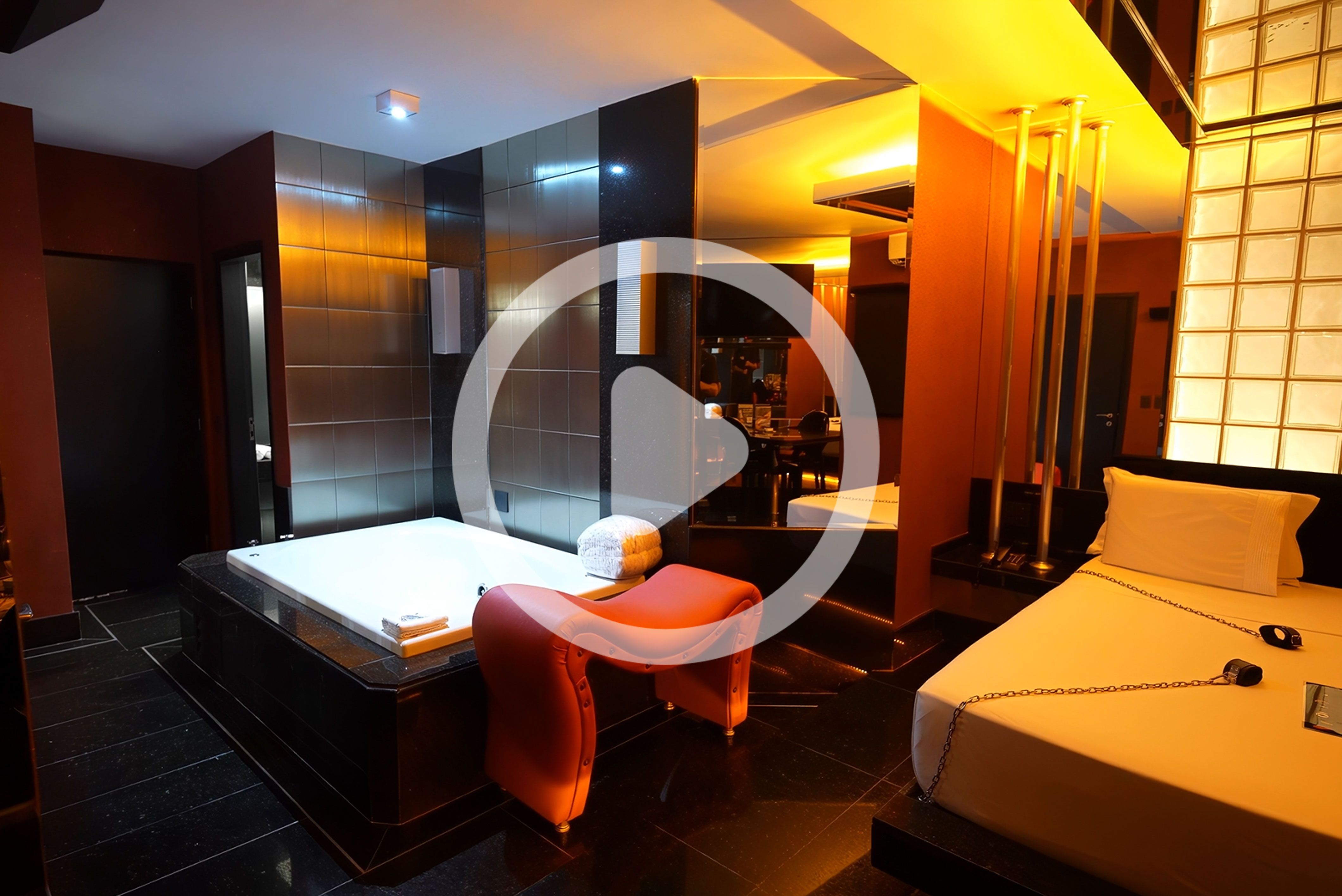 A suíte possui: ar condicionado split, banheira Jacuzzi, canais eróticos, adega, wi-fi, sauna úmida, super ducha, piso aquecido, poltrona erótica, iluminação fluor vermelha e espelho no teto.