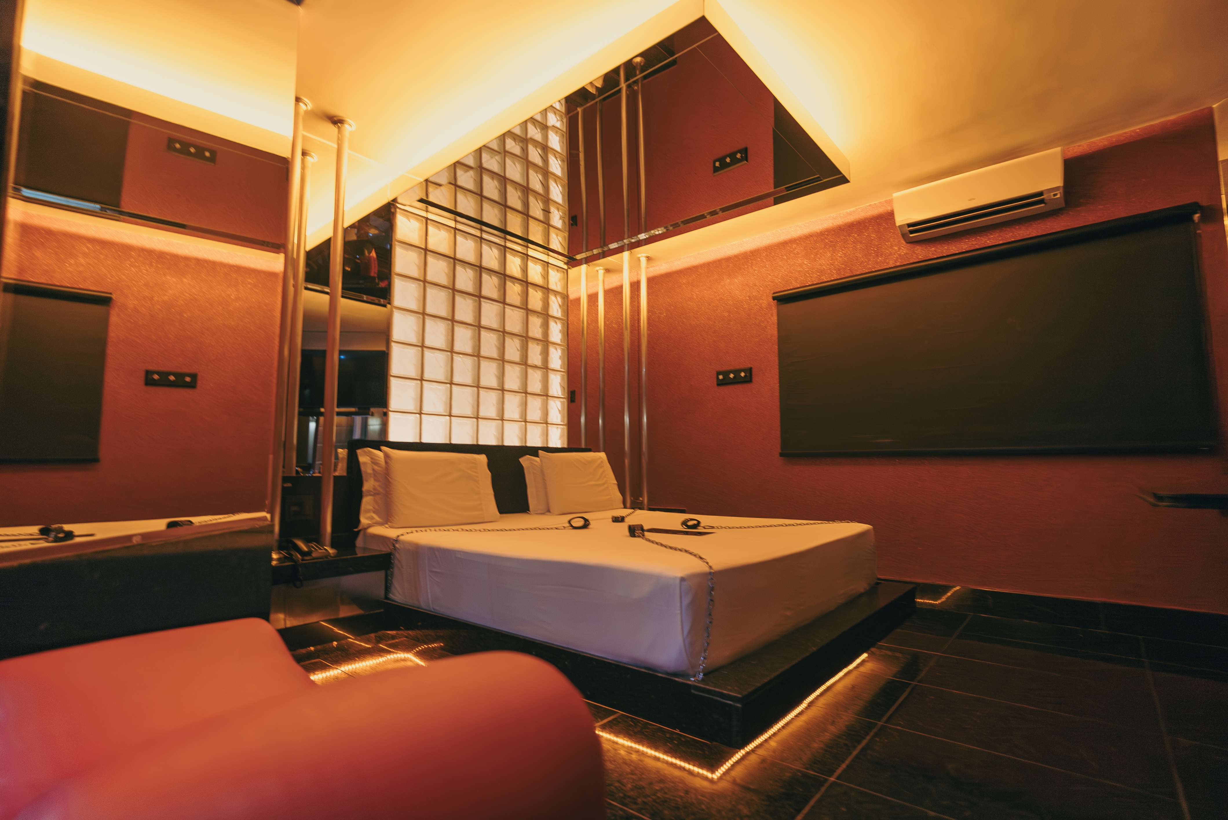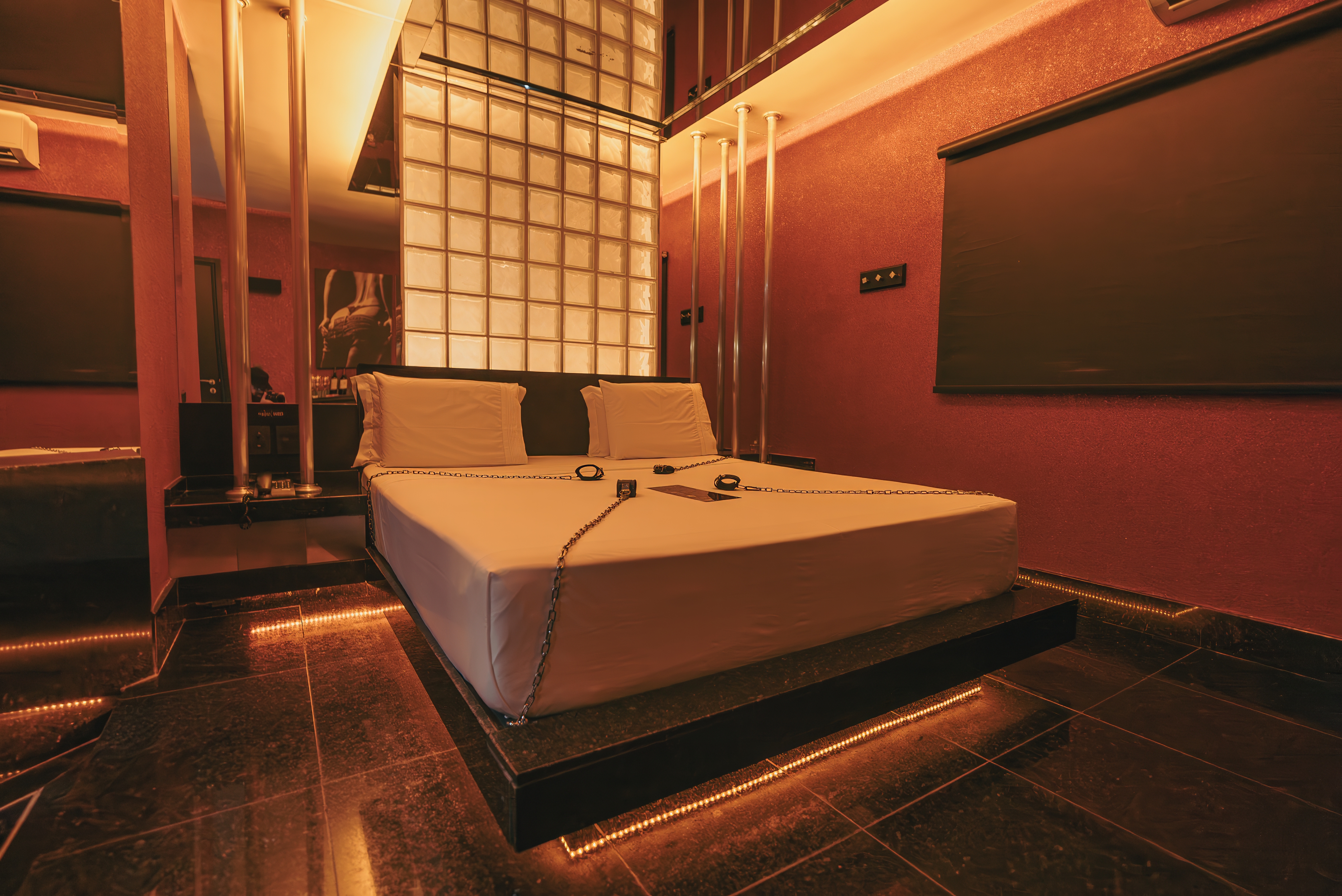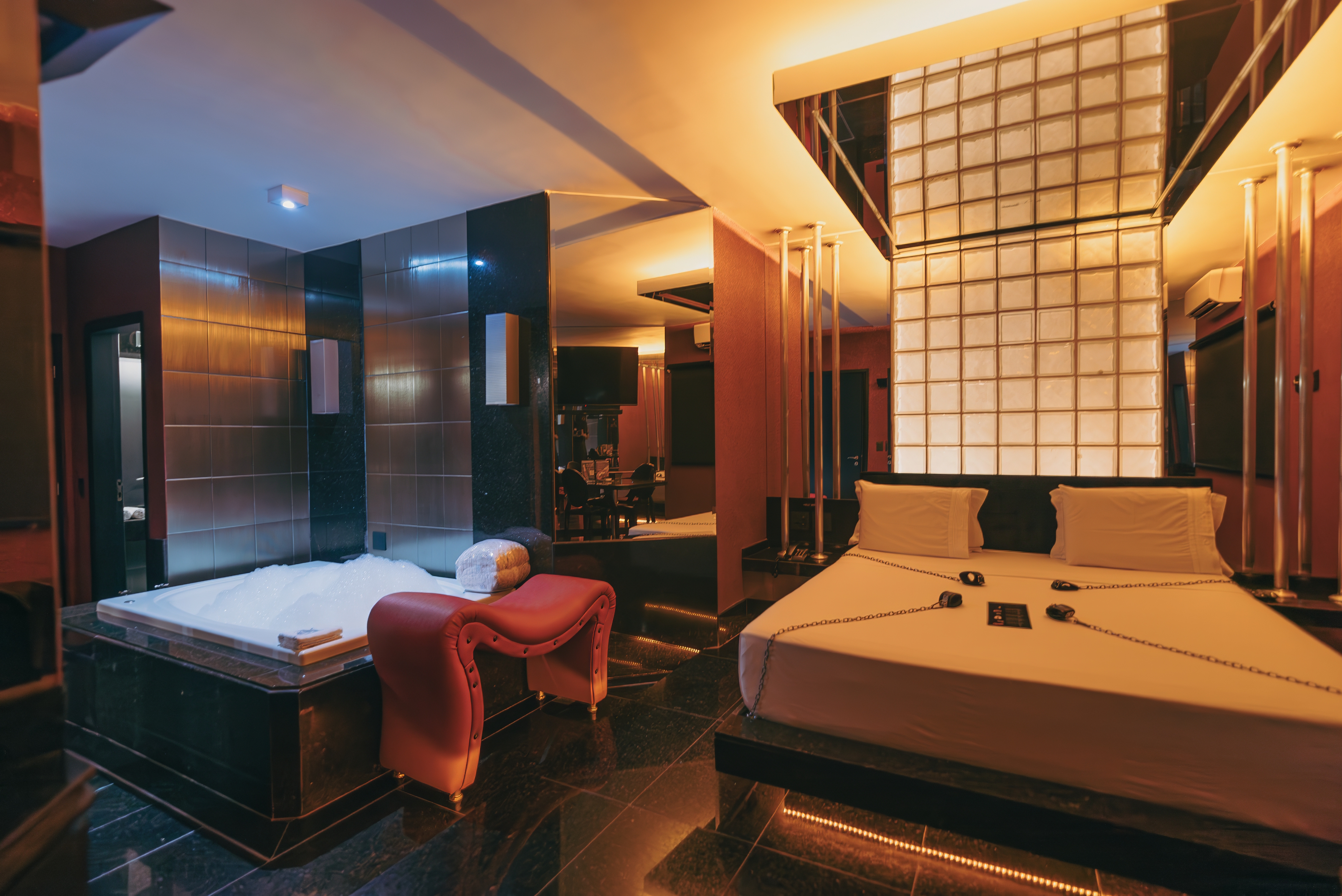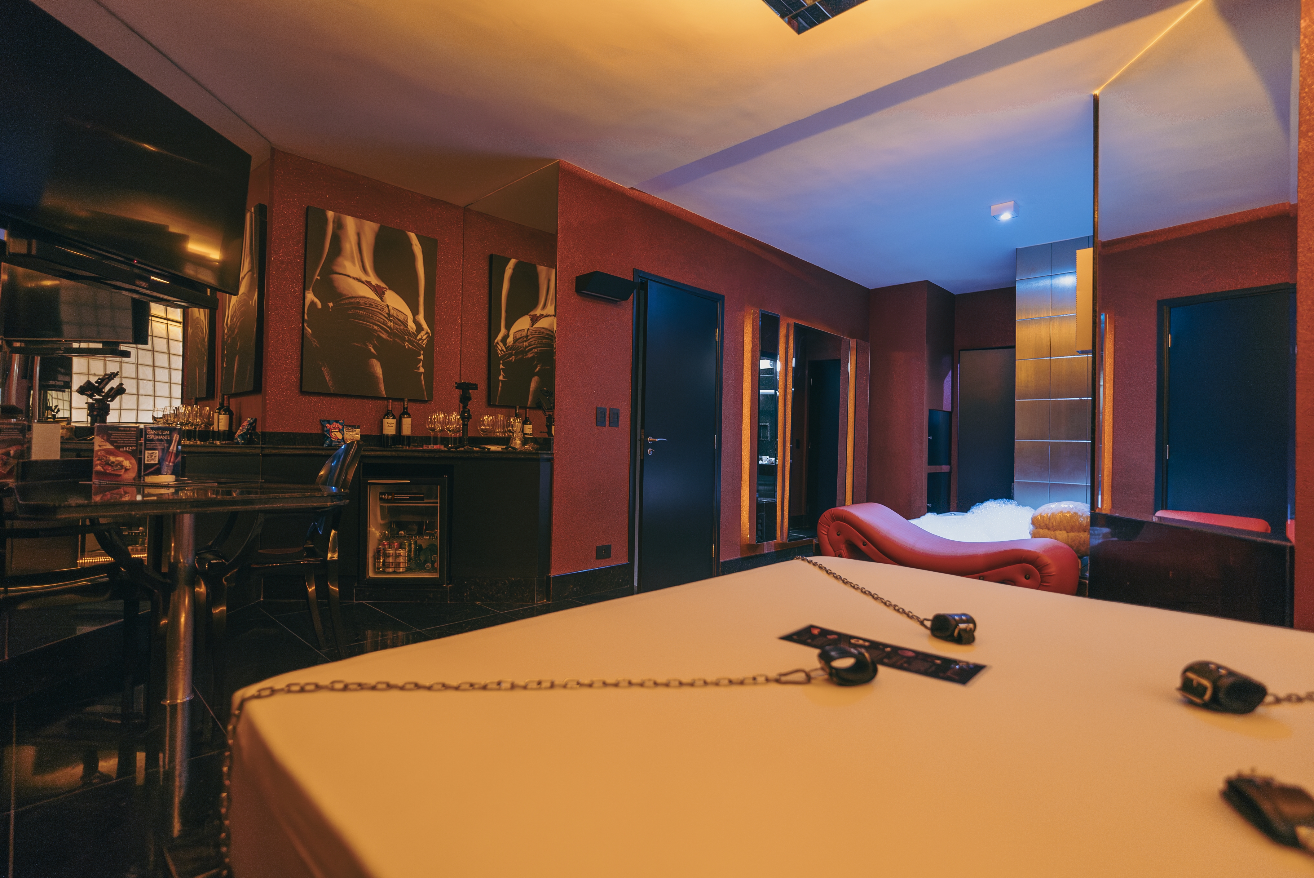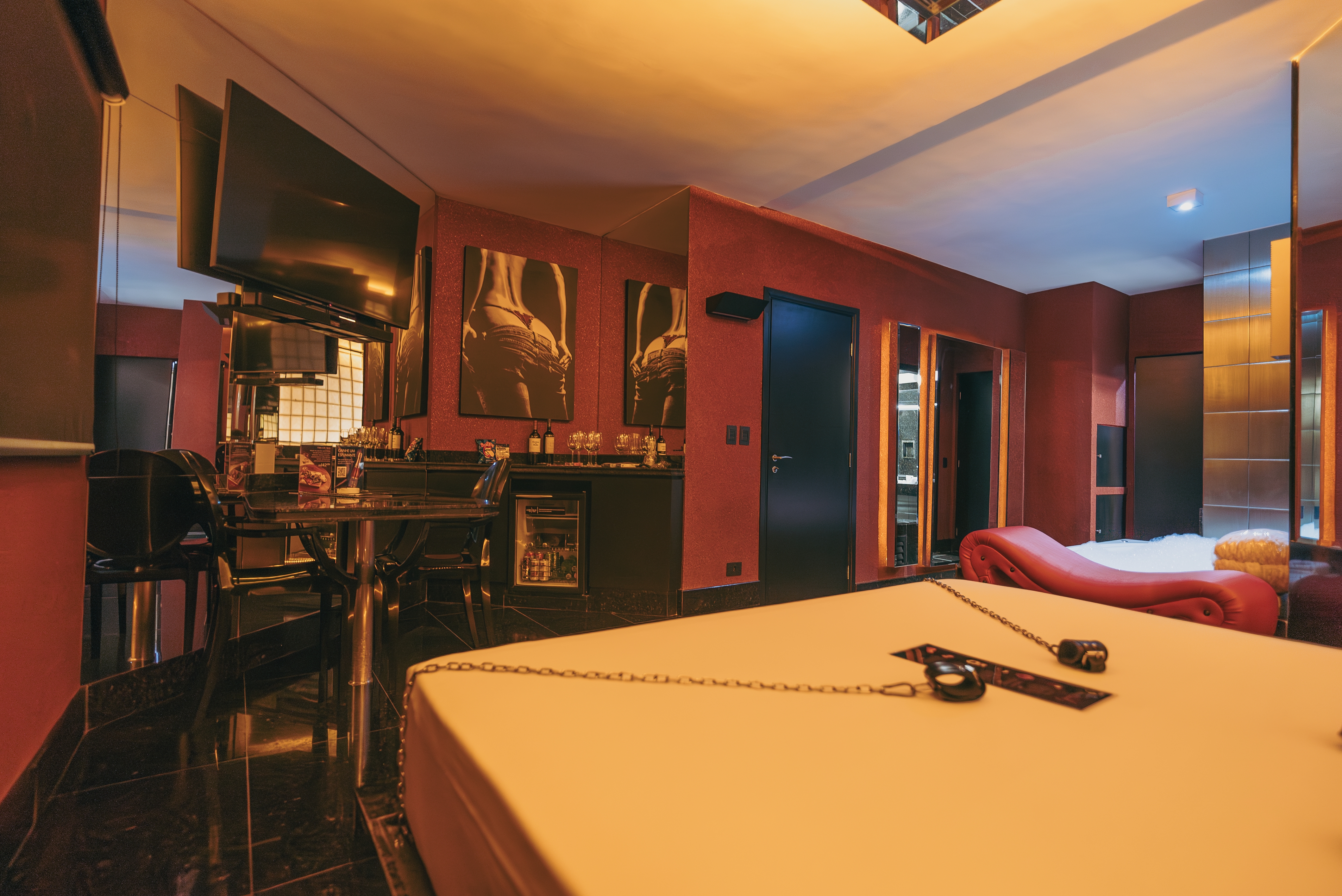 A suíte possui: ar condicionado split, banheira Jacuzzi, canais eróticos, adega, wi-fi, sauna úmida, super ducha, piso aquecido, poltrona erótica, iluminação fluor vermelha e espelho no teto.