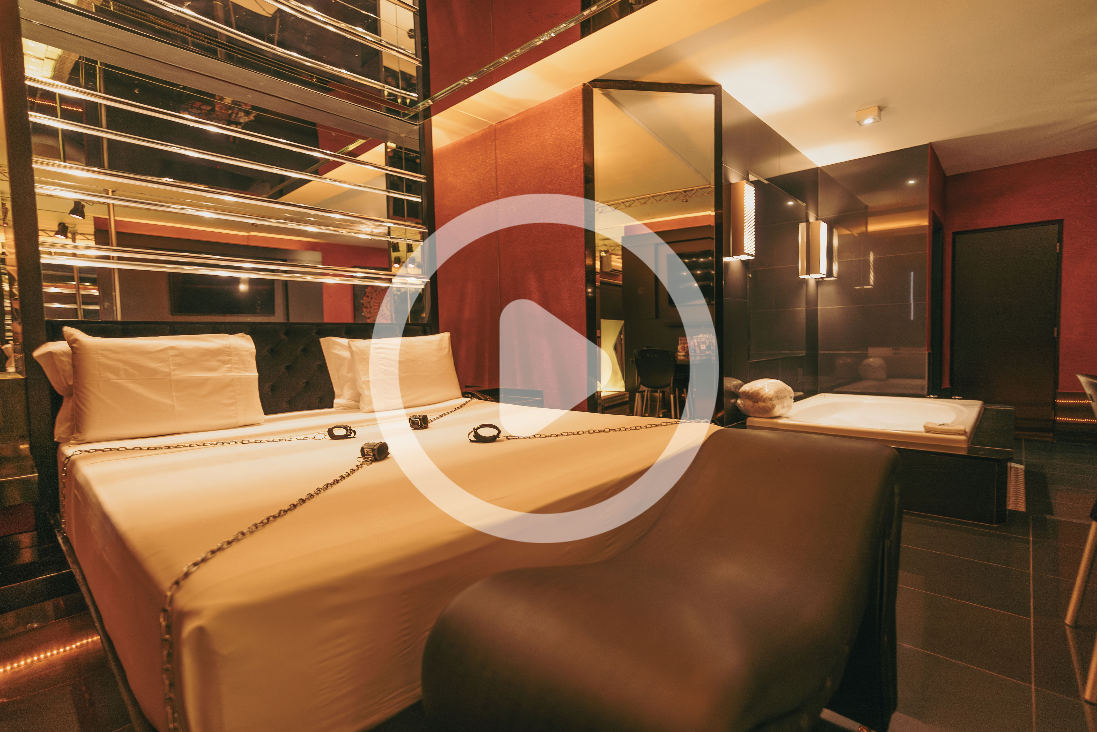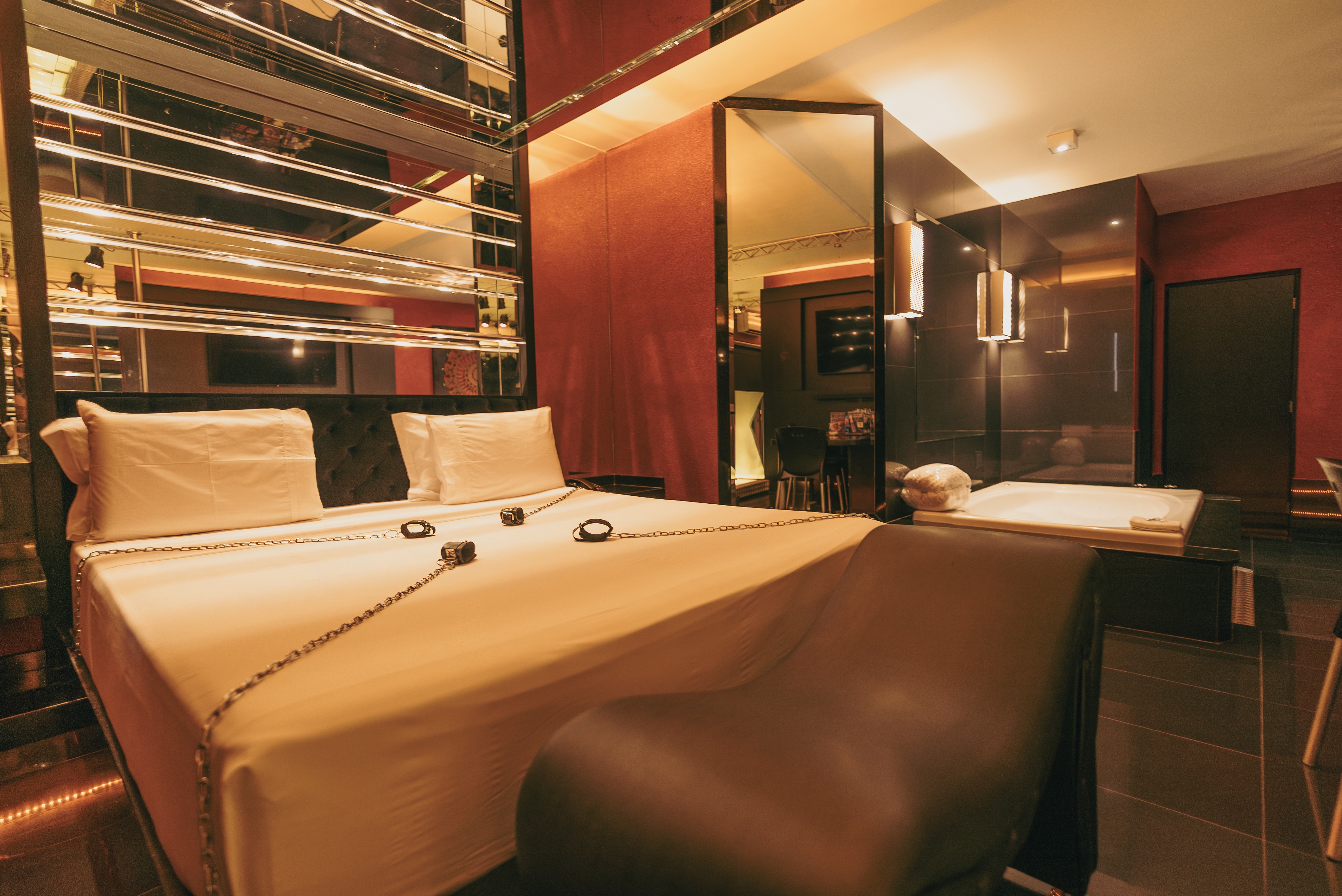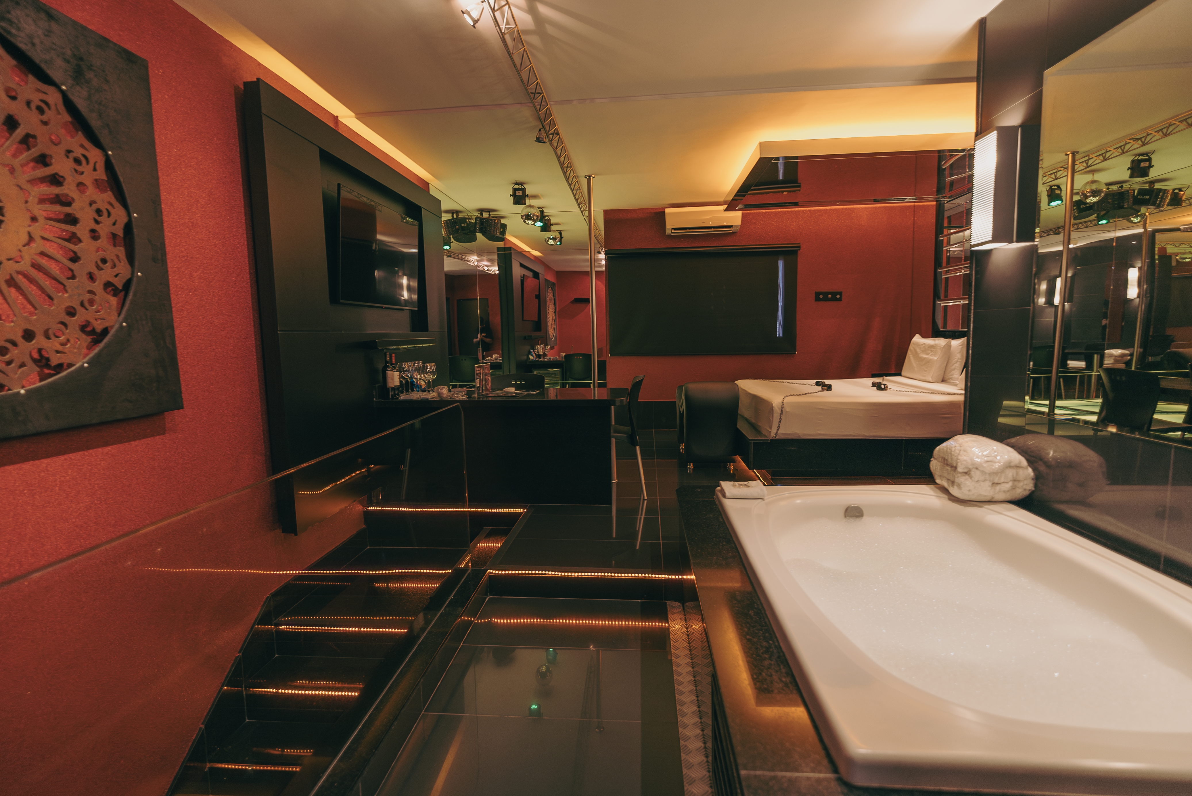 Confira seus atributos: ar condicionado split, poltrona erótica, banheira Jacuzzi, canais eróticos, adega, wi-fi, sauna úmida, super ducha, piso aquecido, iluminação fluor vermelha e espelho no teto, TV 50".