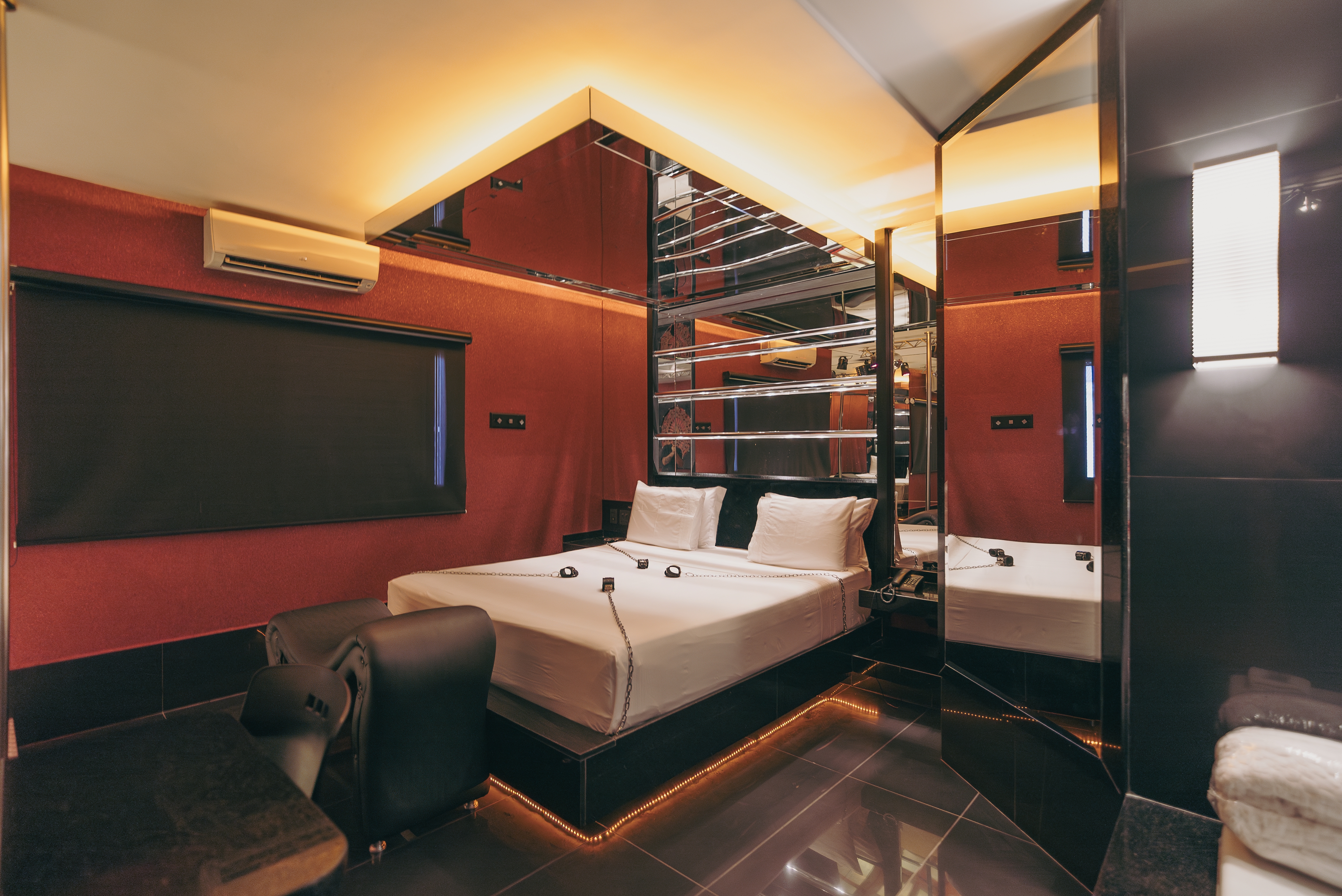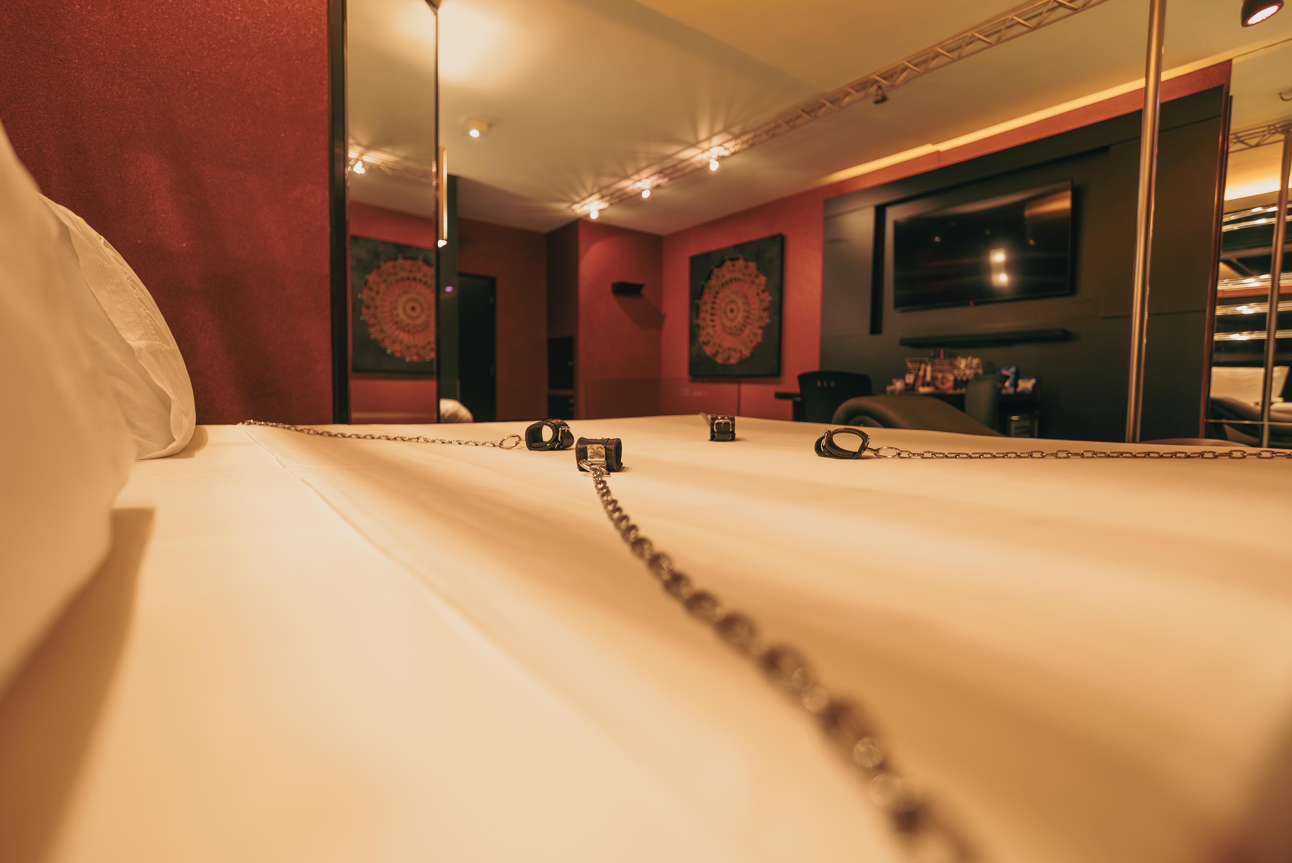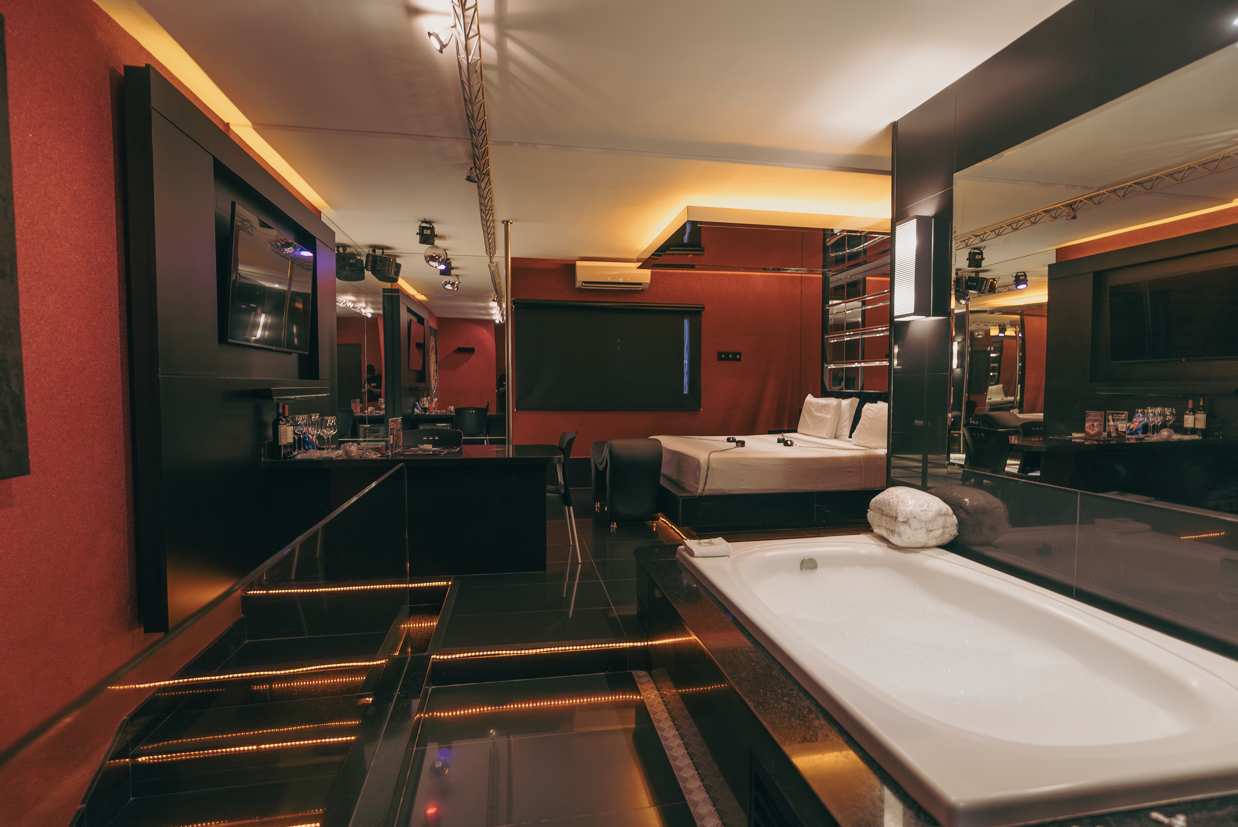 Confira seus atributos: ar condicionado split, poltrona erótica, banheira Jacuzzi, canais eróticos, adega, wi-fi, sauna úmida, super ducha, piso aquecido, iluminação fluor vermelha e espelho no teto, TV 50".