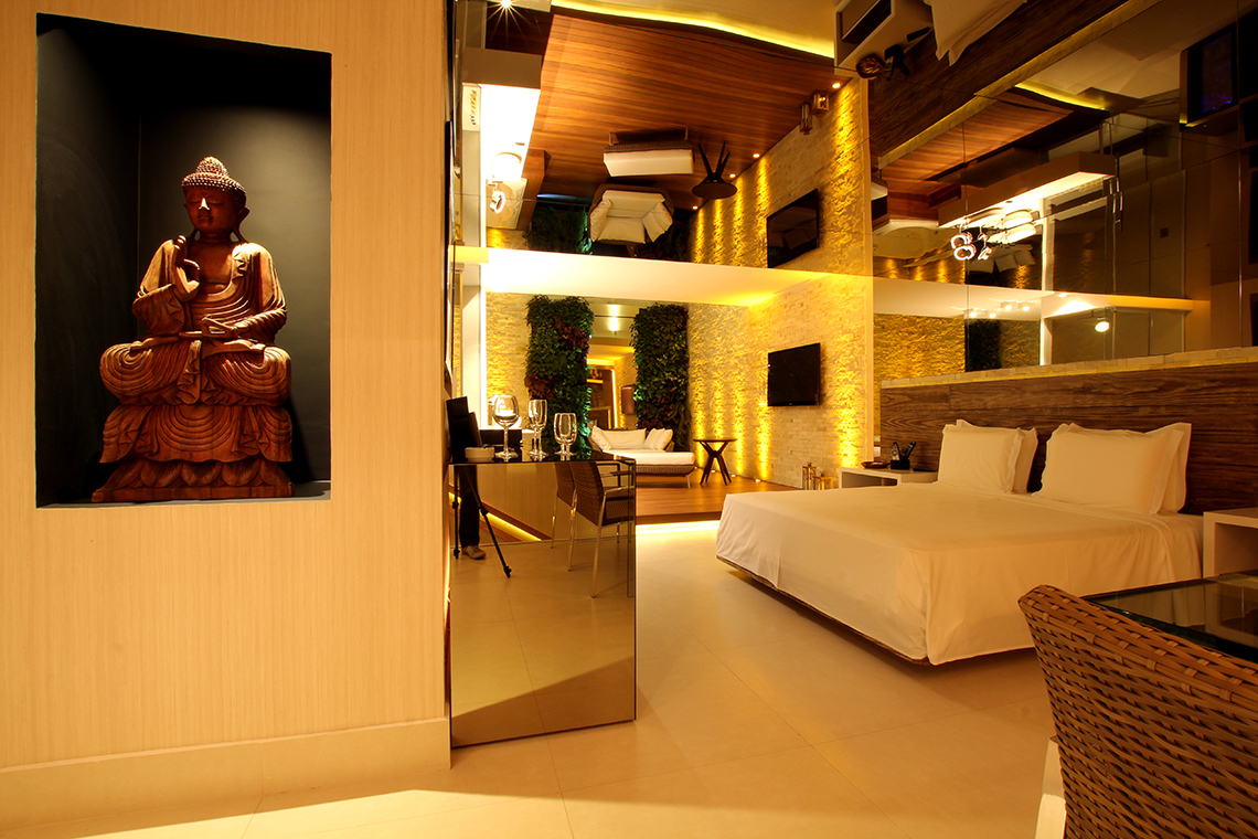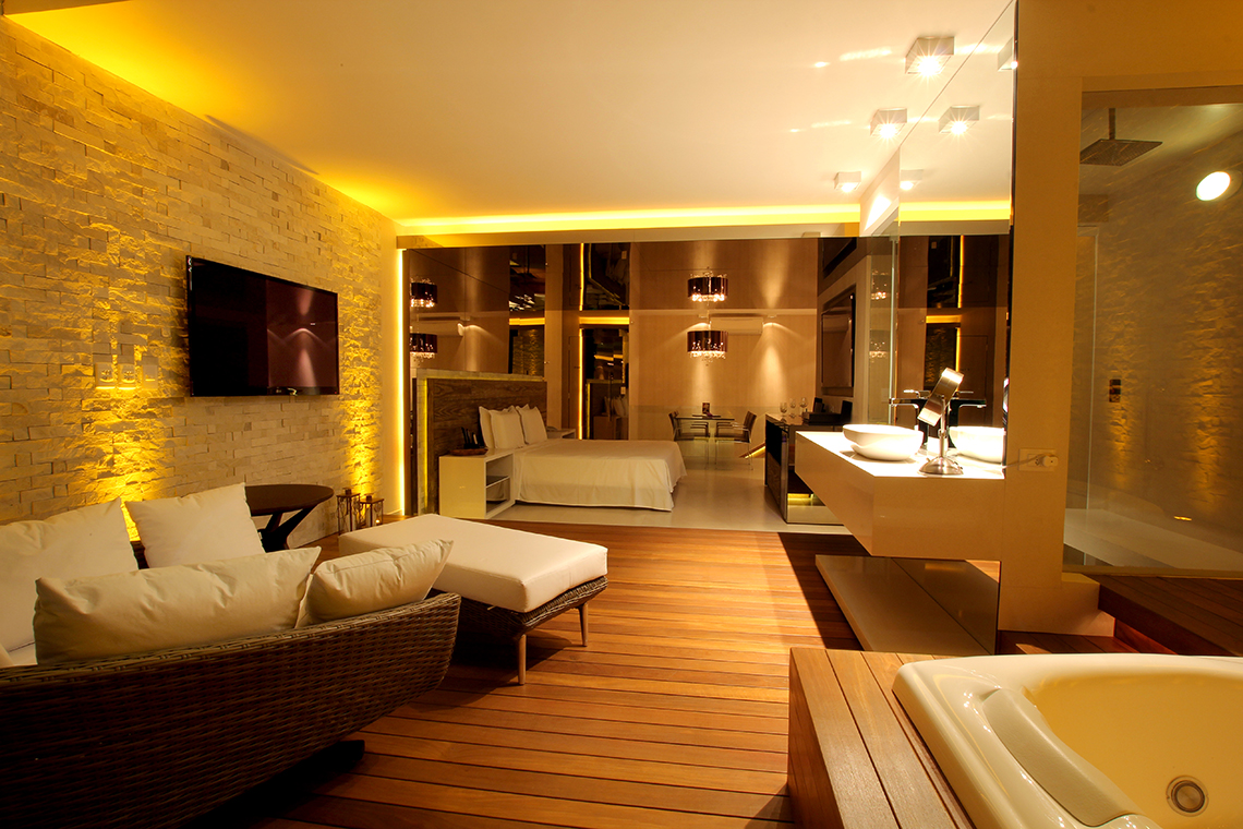 A Suíte oferece: ar condicionado split, canais eróticos, adega, wi-fi, mini spa, ducha de cromoterapia, piso aquecido e espelho no teto.